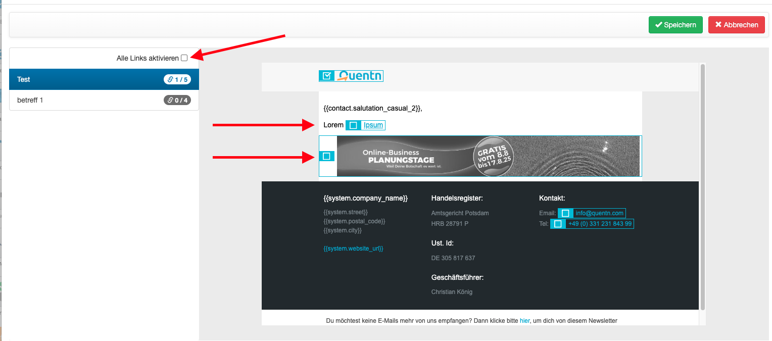 Bitte beachte: Wenn du das Element konfiguriert hast und zu einem späteren Zeitpunkt weitere E-Mails hinzufügst, musst du die neuen Links noch anhaken, sofern du auf die Klicks reagieren möchtest!