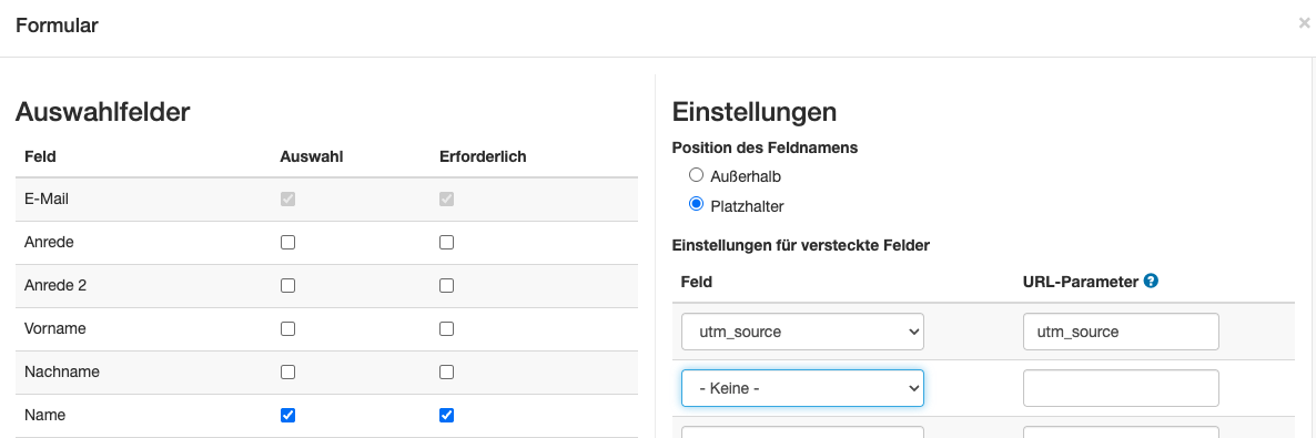 Danach fügst Du alle Felder hinzu, die abgefragt werden sollen — also sowohl die sichtbaren Formularfelder als auch die Felder für die UTM-Parameter.