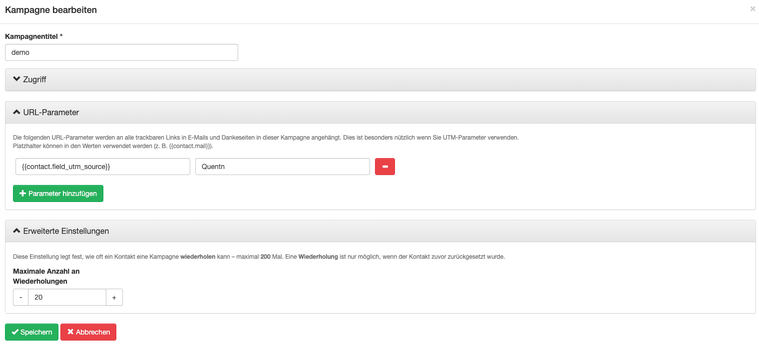 Sobald ein Kontakt über einen Link mit angehängten Parametern auf die Landingpage oder das Formular kommt, können diese Werte übernommen, gespeichert und bei Bedarf auch wieder weitergegeben werden.