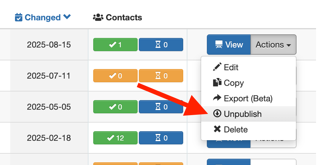 To do this, go to the campaign overview, click the “Actions” button to the right of the respective campaign, and then select the option “Unpublish.”