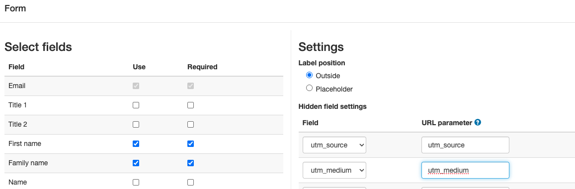 Then add all the fields that should be collected — both the visible form fields and the fields for the UTM parameters.