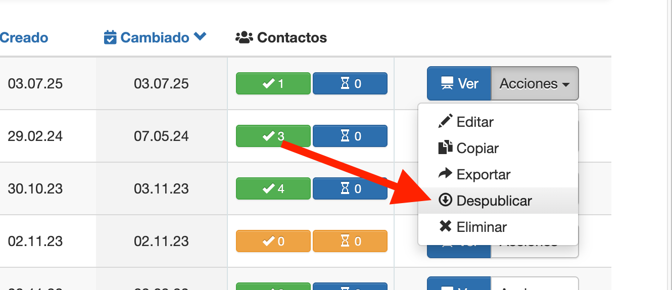Para hacerlo, ve al resumen de campañas, haz clic en el botón “Acciones” a la derecha de la campaña correspondiente y selecciona la opción “Despublicar.”