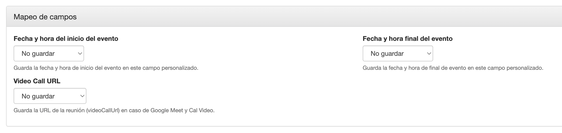 Ahora puedes asignar campos adicionales (opcional). Puedes pasar la fecha y hora de inicio y fin de la reunión, así como la URL de la videollamada.